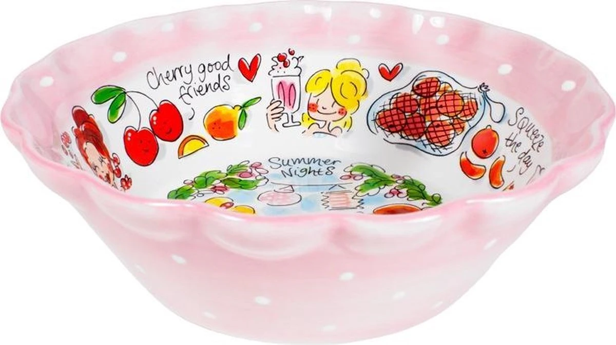 Deze leuke kom is geïllustreerd met stukjes fruit en de kenmerkende vriendinnen van de Even Bijkletsen serie. De buitenkant van de kom heeft een vrolijke, roze stippen print. De kom is perfect te combineren met de fruitschaal en sapkan, maar natuurlijk ook met de rest van het Blond servies.